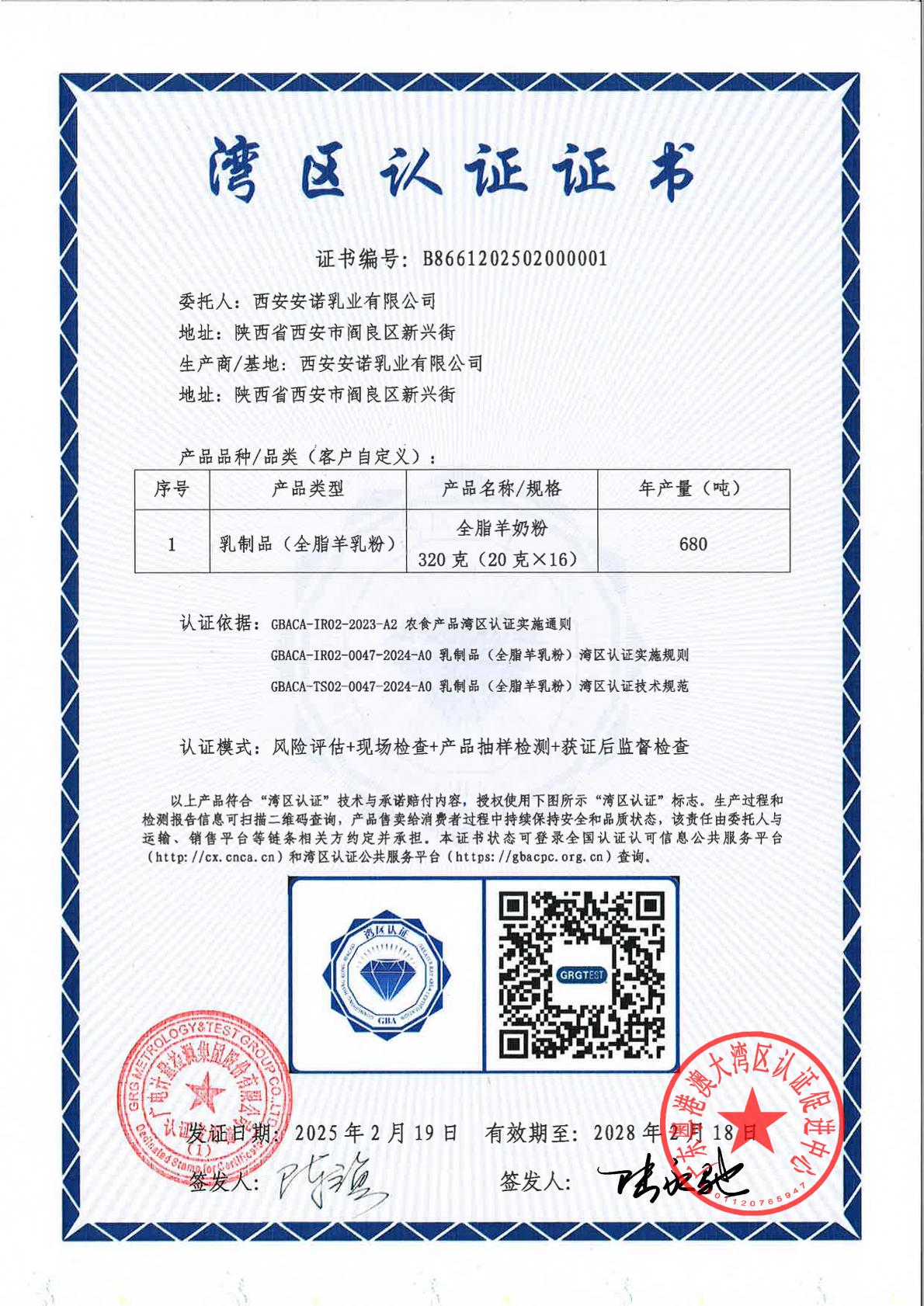 2025年2月19日,安諾乳業(yè)旗下全脂羊奶粉榮獲灣區(qū)認(rèn)證證書(shū),成為粵港澳大灣區(qū)大健康食品領(lǐng)域首批獲得該認(rèn)證的羊乳制品企業(yè)。這不僅是安
